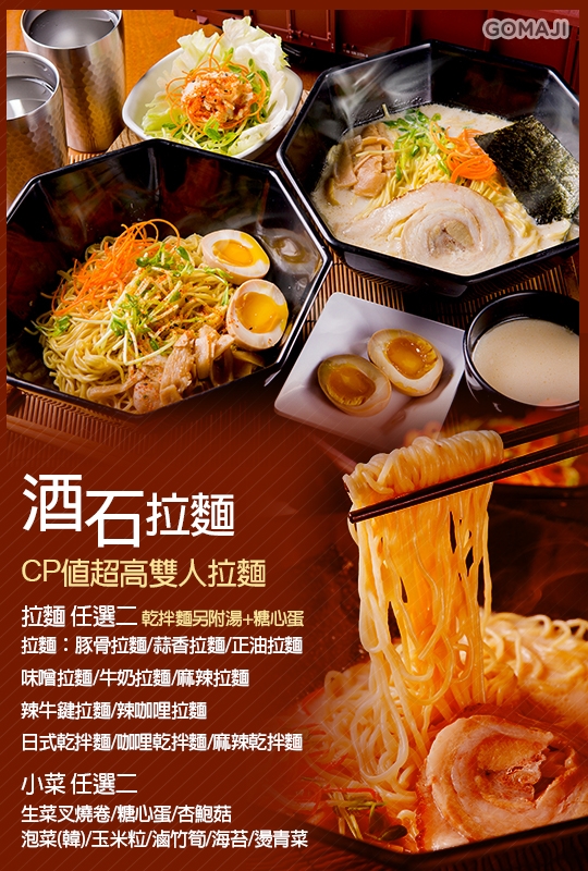 只要198元(雙人價),輕鬆品嚐正宗日式美味!【酒石拉麵】推出豚骨拉麵、正油拉麵、味噌拉麵等多道招牌拉麵任選,醇厚滋味令人神魂顛倒!