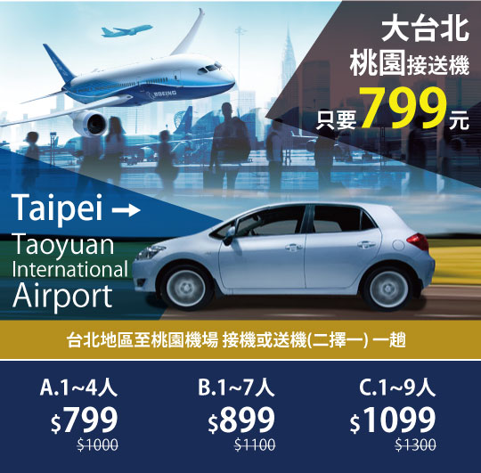 只要799元起,即可享有【柏莉包車旅遊】假日不加價,台北桃園機場接送ABC方案〈含A.1~4人/B.1~7人/C.1~9人 台北地區至桃園機場 接機或送機(二擇一) 一趟〉