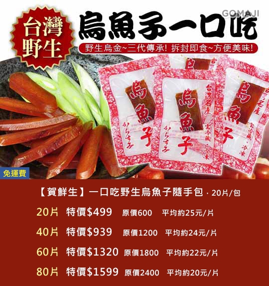 【賀鮮生】一口吃野生烏魚子隨手包 20片起 - 147044是最近關注的一項還算不錯的商品,一樣是在Gomaji上發現的。我真的非常喜歡逛Gomaji,尤其很多東西價格都很不錯,也有不少優惠券可以用,下面是賣場提供的商品簡介: