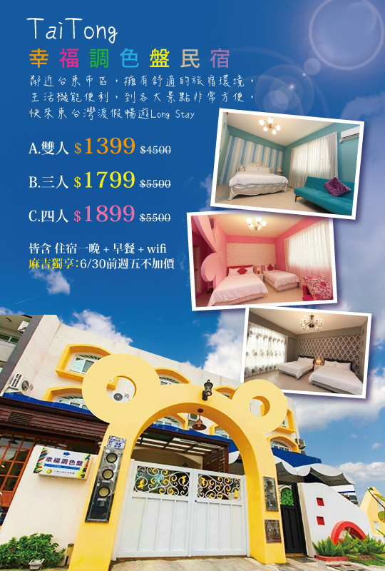 只要1399元起,即可享有【台東-幸福調色盤民宿】鄰近台東市區,擁有舒適的旅宿環境,生活機能便利,到各大景點非常方便,快來東台灣渡假暢遊Long Stay~A.雙人/B.三人/C.四人方案〈含A.二人房/B.三人房/C.四人房 住宿一晚 + 早餐 + wifi〉麻吉獨享:6/30前週五不加價