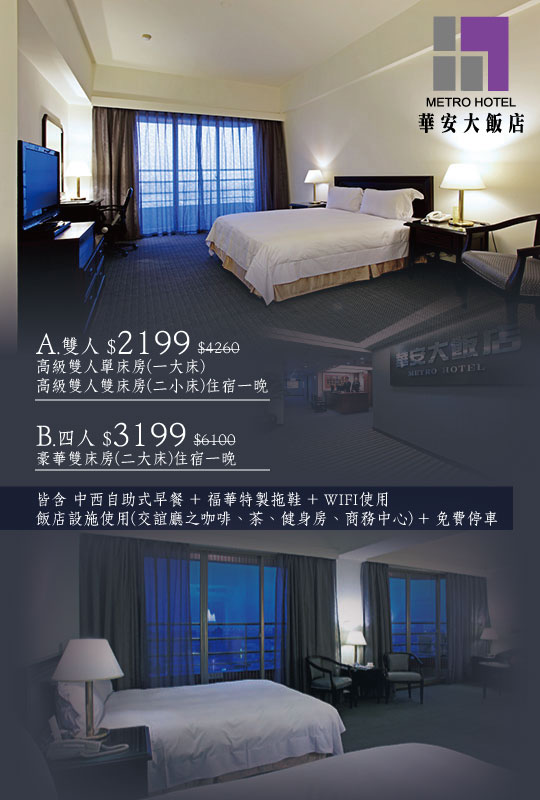 只要2199元起,即可享有【雲林-華安大飯店】福華連鎖?斗六火車站對面~A.雙人/B.四人專案〈含A.(高級雙人單床房(一大床)/高級雙人雙床房(二小床)) / B.豪華雙床房(二大床) 住宿一晚 + 中西自助式早餐 + 福華特製拖鞋 + WIFI使用 + 飯店設施使用(交誼廳之咖啡、茶、健身房、商務中心) + 免費停車〉